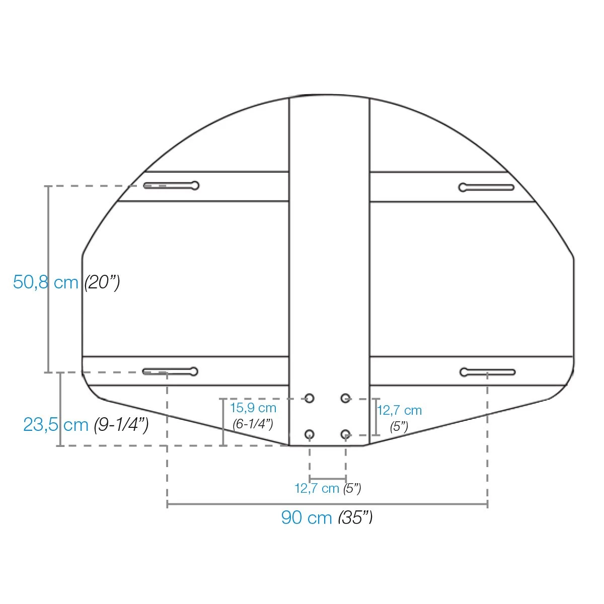 - Standard 20″ x 35″ (51 cm x 89 cm) fan-type backboard mounting holes