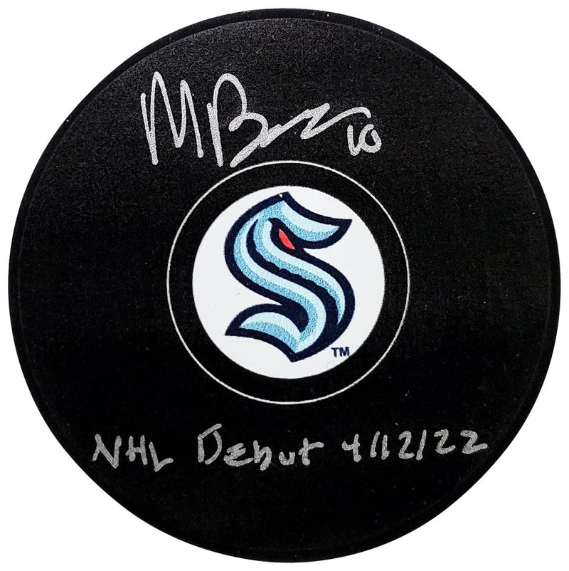 You are purchasing a Matty Beniers hand signed official Seattle Kraken hockey puck with a “NHL Debut 4/12/22” inscription.